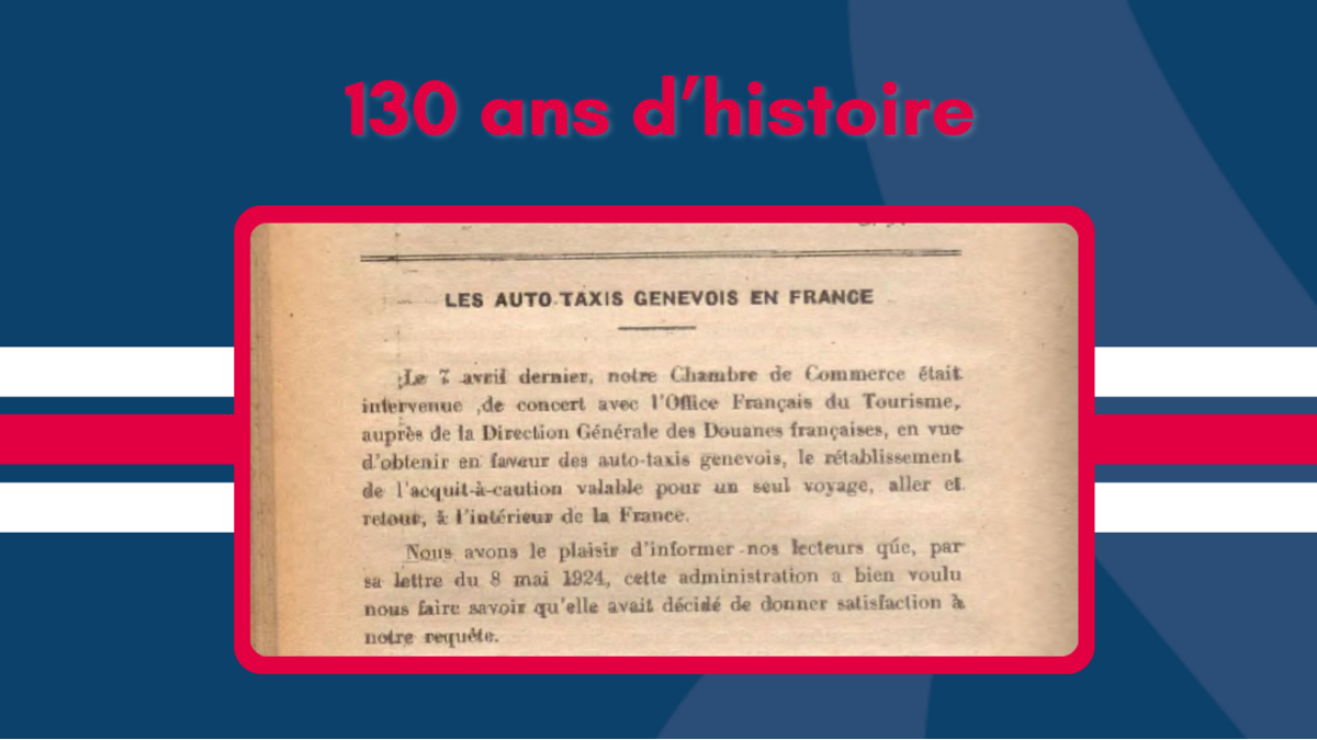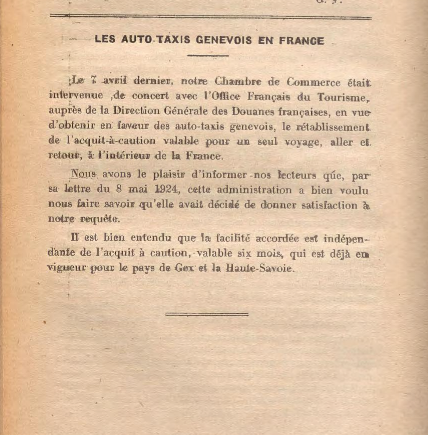 Ce fut le cas notamment le 7 avril 1924, date à laquelle "notre Chambre de Commerce était intervenue, de concert avec l'Office Français du Tourisme, auprès de la Direction Générale des Douanes françaises, en vue d'obtenir en faveur des auto-taxis genevois, le rétablissement de l'acquit à caution valable pour un seul voyage, aller et retour, à l'intérieur de la France."