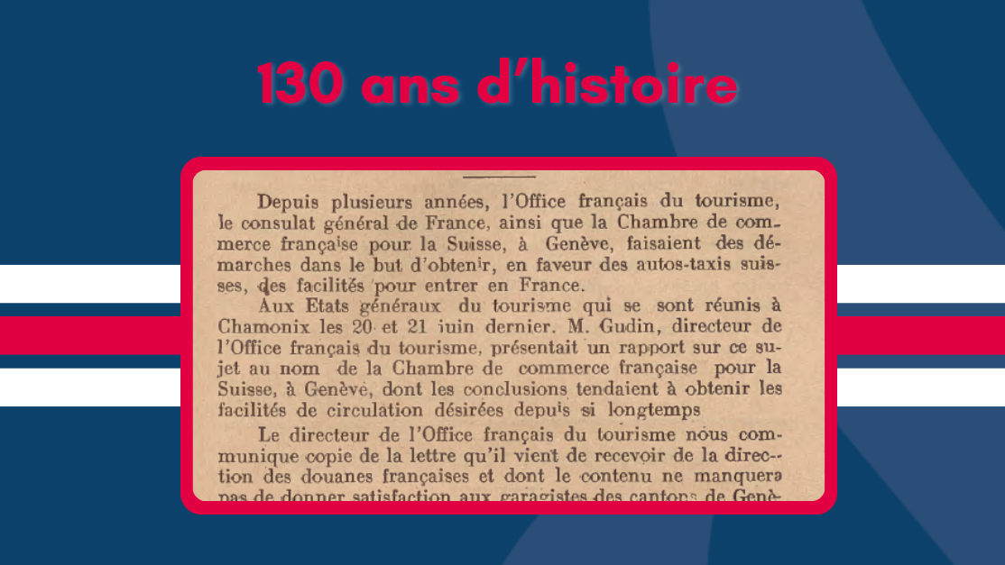 Depuis ses débuts, la Chambre de Commerce France-Suisse a joué un rôle clé dans l'accompagnement des entreprises, facilitant leur expansion transfrontalière. En 1925, notre Chambre, en collaboration avec l'Office Français du Tourisme, s'engageait pour obtenir des facilités de circulation pour les autos-taxis suisses en France, un exemple concret de notre soutien aux entreprises de mobilité transfrontalière.