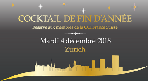 L'antenne zurichoise de la CCI France Suisse organise le mardi 4 décembre à Zurich un cocktail de fin d'année, l'occasion de partager une soirée conviviale avec les membres du 1er réseau d'affaires franco-suisse et les remercier pour leur fidélité.