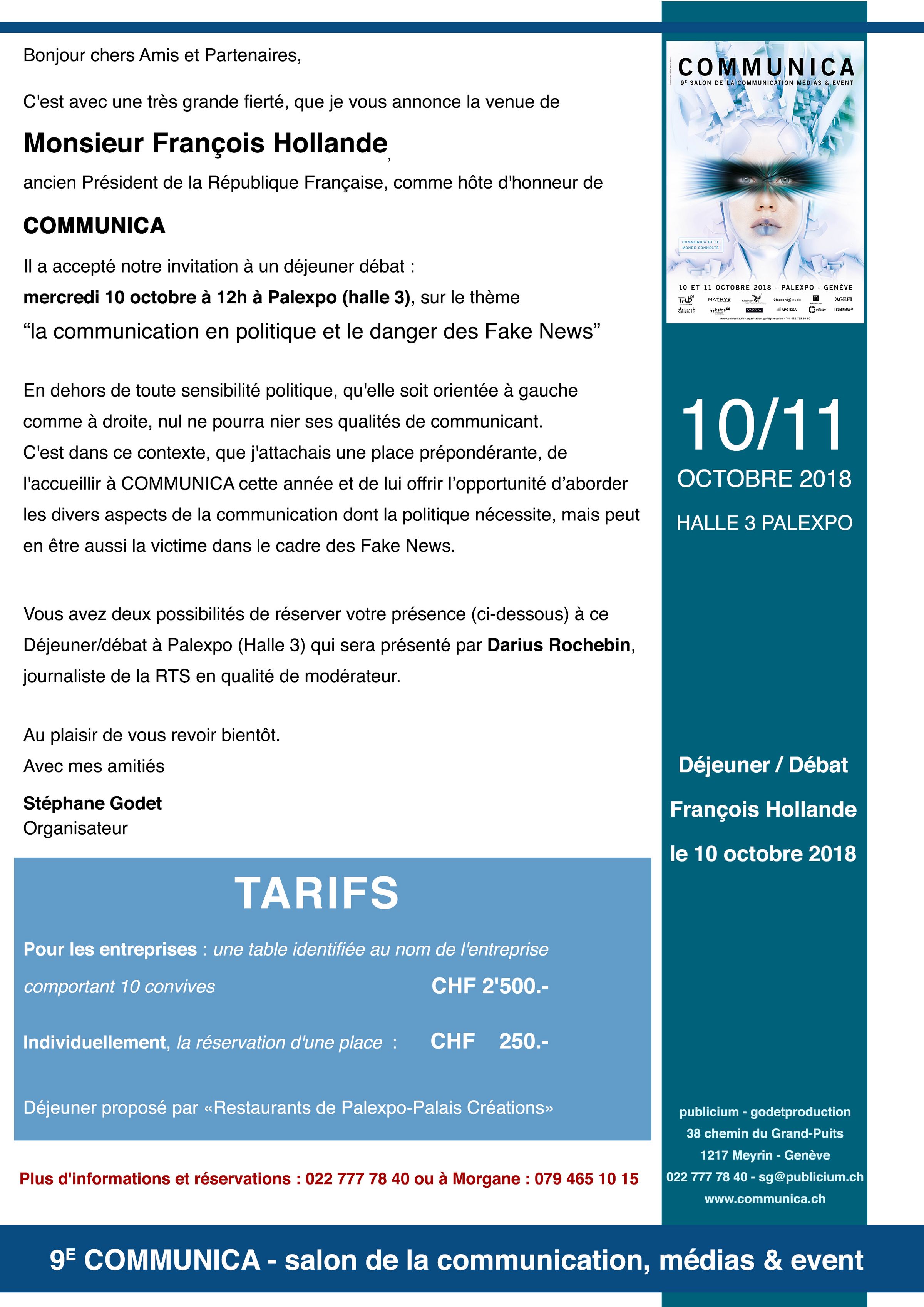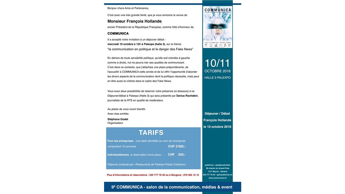 Hôte d’honneur communica 2018, Monsieur François Hollande l’ancien Président de la République Française sera présent pour un déjeuner-débat animé par Darius Rochebin Sur le thème « la communication en politique et le danger des Fake-News » Le mercredi 10 octobre 12h00 à Palexpo, Halle3