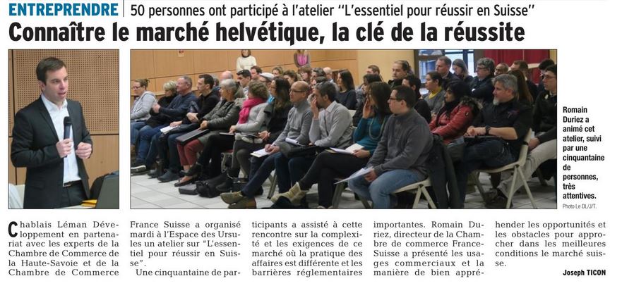 Une cinquantaine de participants a pris part à cet événement à l'Espace des Ursules à Thonon-les-Bains. Romain Duriez, directeur de la CCIFS, y est notamment revenu sur toutes les particularités du marché helvétique et a donné des conseils pour aborder au mieux les affaires en Suisse. Le Dauphiné libéré a d'ailleurs consacré un bref article à cette rencontre que vous pouvez consulter en cliquant ici.