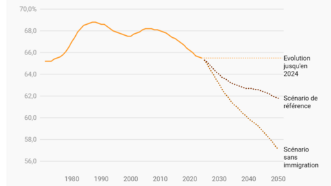 Cette évolution s'explique principalement par l'augmentation du nombre de personnes âgées de plus de 65 ans. Depuis 2004, cette tranche d'âge a augmenté de 50%, soit une augmentation absolue de plus de 600 000 personnes. Sur la même période, la part des 15-64 ans a augmenté de 17%. La croissance de la population âgée de 15 à 64 ans s'explique principalement par la migration nette, qui concerne principalement les personnes en âge de travailler. Malgré l'immigration, la part de la population en âge de travailler a diminué, passant de plus de 68% en 2004 à 65,5% en 2024. En raison du vieillissement de la population, cette évolution se poursuivra dans les années à venir, mais la migration continuera d'atténuer cet effet. Dans un scénario sans immigration nette, la part diminuerait en revanche de manière beaucoup plus importante.