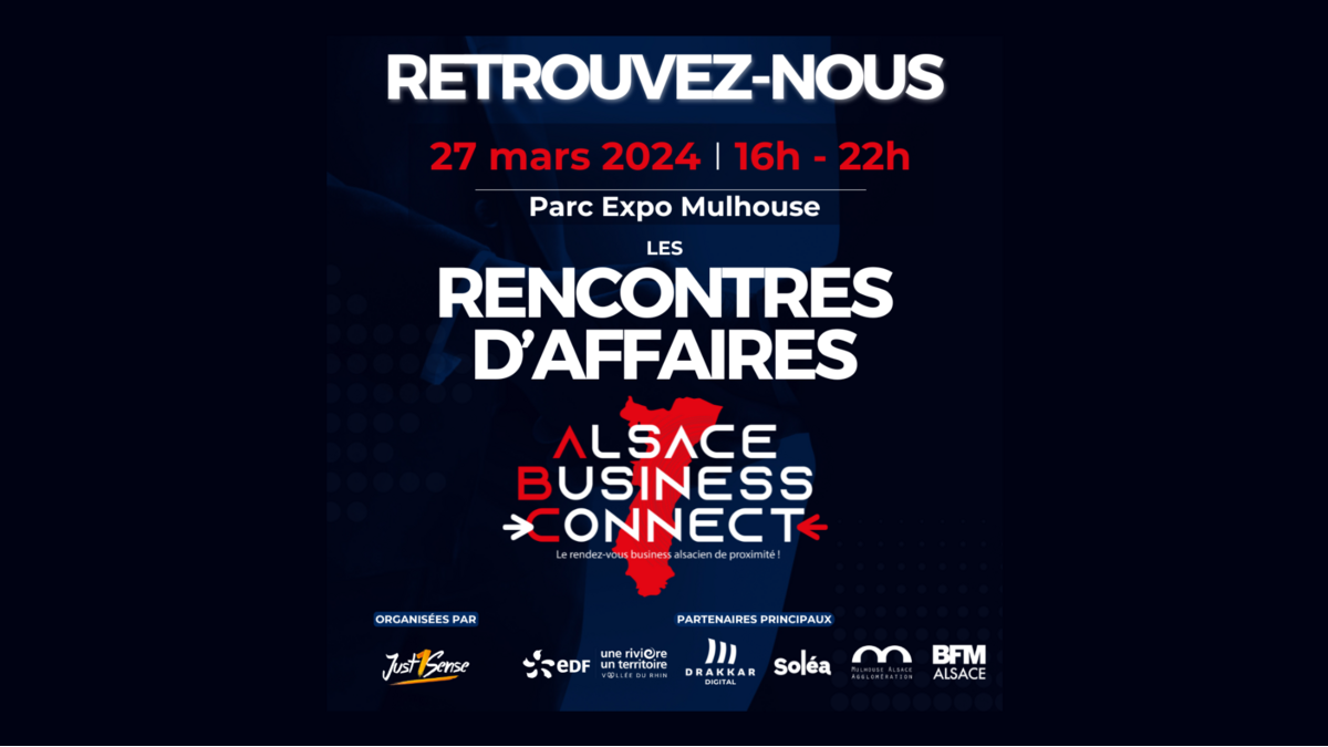 Les rencontres d'affaires Alsace Business Connect, organisées par Just1sense, se tiendront le mercredi 27 mars au Parc Expo de Mulhouse de 16h à 22h.