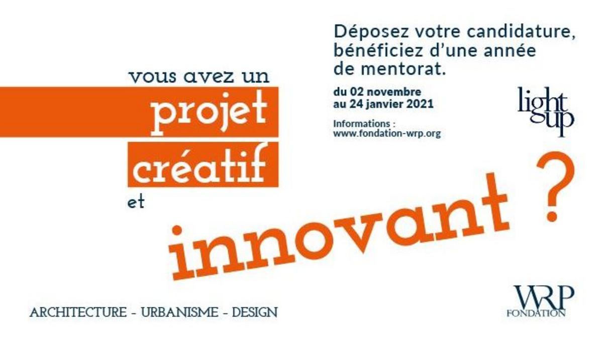 Vous avez moins de 35 ans, vous exercez votre activité professionnelle dans le domaine de l’urbanisme, l’architecture ou encore le design en Suisse, en France ou au Maroc ? Vous avez développé, seul ou en équipe, une création innovante ou vous avez un projet concret qui vous tient à cœur ? Dans le cadre du programme de mentorat Light’Up porté par la Fondation WRP, participez à l’appel à candidatures ouvert jusqu’au 24 janvier 2021.