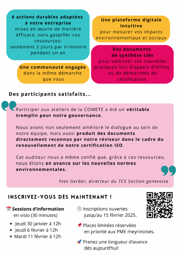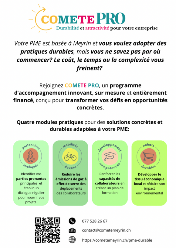 La CCI France-Suisse relaie cette opportunité proposée par l’un de ses partenaires : COMETE PRO, un programme d’accompagnement gratuit pour aider les PME meyrinoises à adopter des pratiques plus durables, simplement et efficacement.