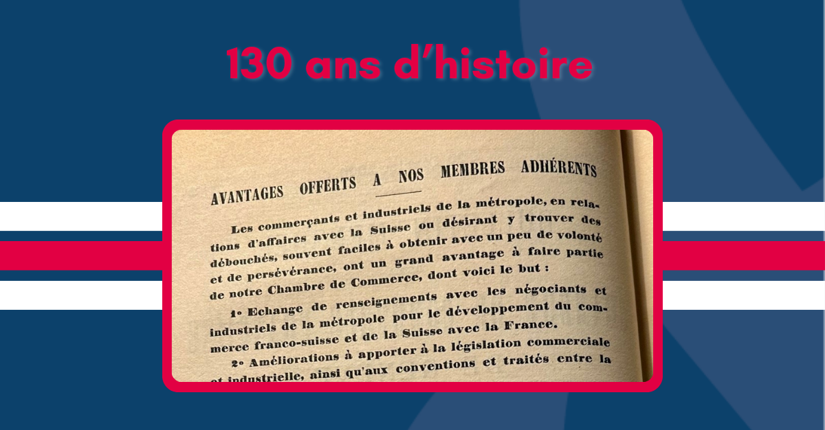 Pour le premier article de cette chronique, nous vous proposons de remonter jusqu'en 1907, une époque où notre Chambre de Commerce informait déjà ses membres sur les avantages concrets de leur adhésion. Dans le « bulletin », ancêtre de notre newsletter France Suisse Express, de nombreux avantages relatifs à une adhésion résonnent encore aujourd'hui : échange de renseignements avec les négociants et industriels de la métropole pour dynamiser le commerce franco-suisse, renseignements sur la législation du pays, indication des procédés d'achat en Suisse... La forme à naturellement évoluée depuis, mais le fond reste toujours le même : informer, animer et défendre notre réseau de membres.