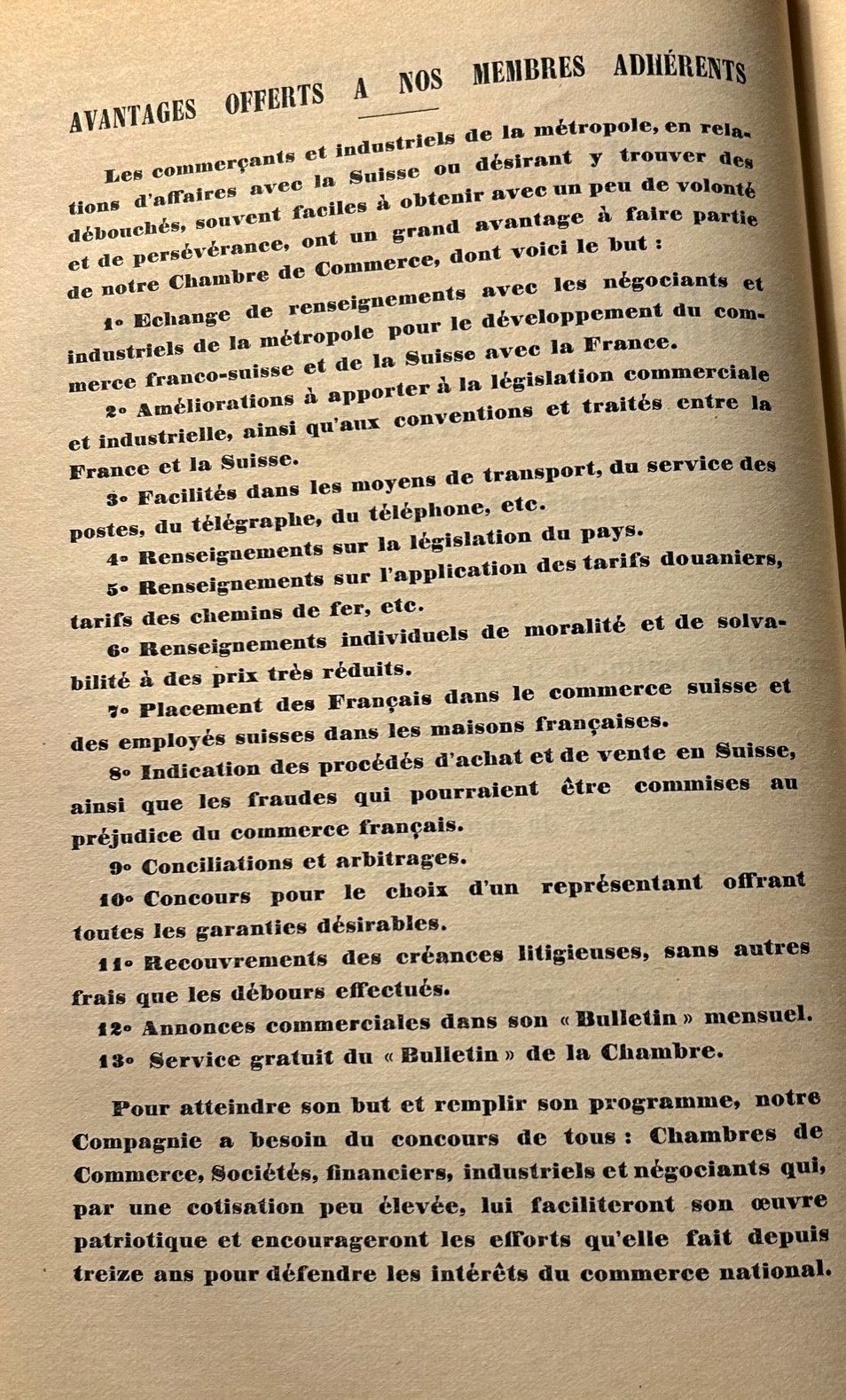 Nous attirons également votre attention sur les quelques lignes en préambule qui précisent que les "commerçants et industriels de la métropole, en relation d'affaires avec la Suisse ou désirant y trouver de débouchés souvent faciles à obtenir avec un peu de volonté et de persévérance, ont un grand avantage à faire partie de notre Chambre de Commerce".