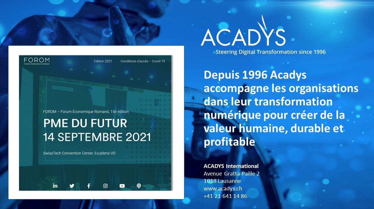Aux côtés d'acteurs clés de l'économie romande, Acadys International partagera sa vision et ses expériences sur les leviers de gouvernance et de transformation numériques des PME suisses en cette période remplie de défis humains, économiques et sociétaux.
