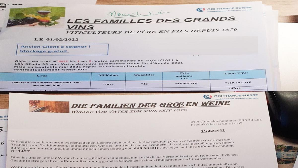 Usurpation d'identité de la CCI France Suisse avec des factures et bons de livraison pour du vin.