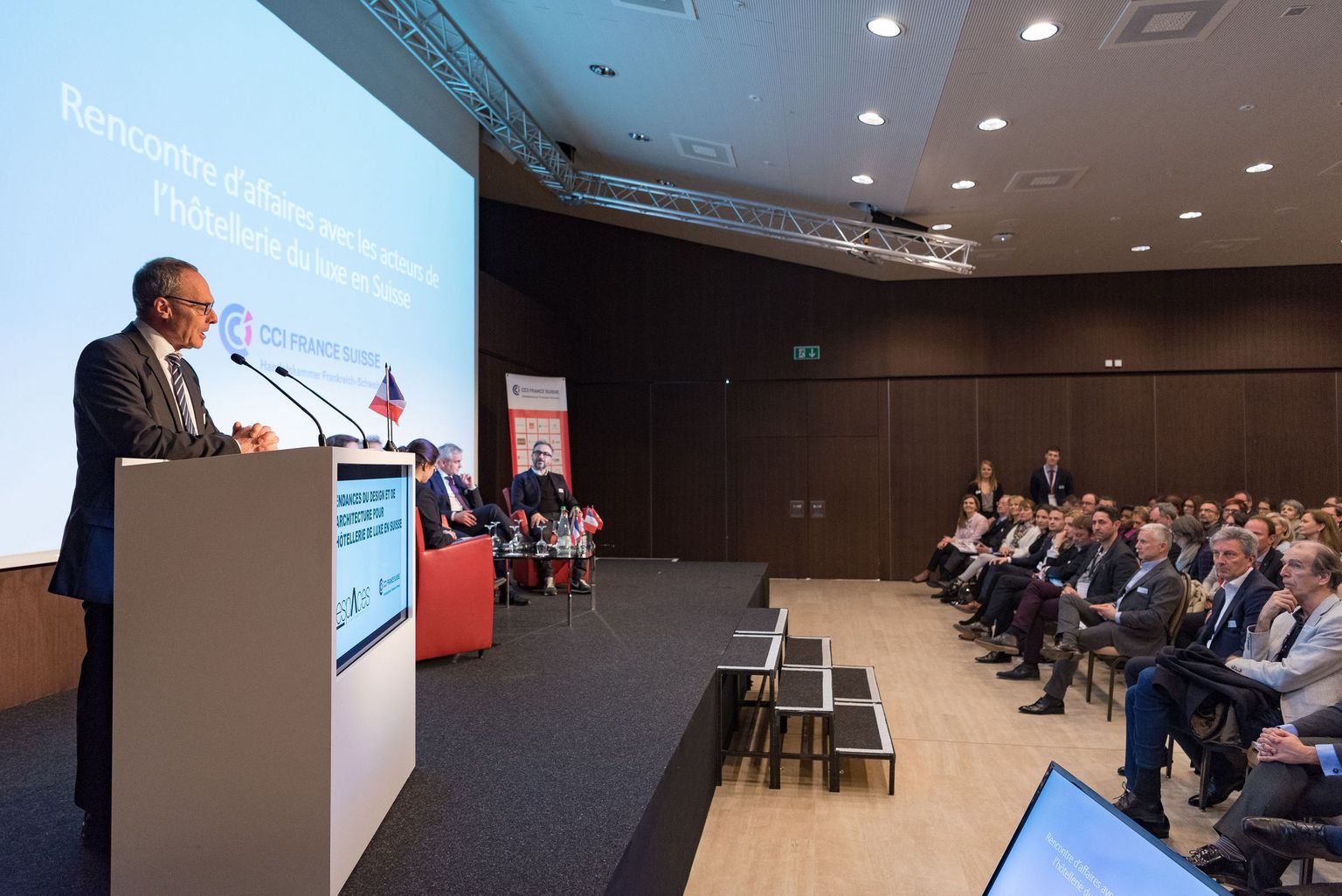 Cet événement organisé sur deux jours par la CCI France Suisse s'est ouvert au Lausanne Palace par une conférence sur les modalités de réalisation d’un chantier en Suisse, abordant des thèmes d’importance tels que le détachement de personnel, le passage en douane, la TVA et la représentation fiscale. A suivi l'allocution de Romain Duriez, directeur de la CCIFS. Son propos a porté sur le contexte helvétique et sur les pratiques à adopter pour les entrepreneurs français afin d'aborder au mieux ce marché très concurrentiel. Ce premier cycle de conférences s'est conclu sur l'intervention de Gunther Lepoutre, fondateur de Forge & Design. Il est revenu sur son parcours en Suisse, en évoquant les difficultés rencontrées mais en insistant néanmoins sur le bilan très positif de cette expérience.