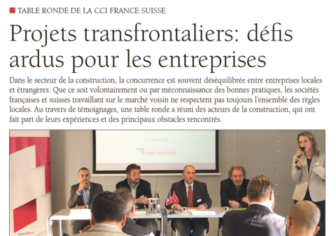 Dans le secteur de la construction, la concurrence est souvent déséquilibrée entre entreprises locales et étrangères. Que ce soit volontairement ou par méconnaissance des bonnes pratiques, les sociétés françaises et suisses travaillant sur le marché voisin ne respectent pas toujours l’ensemble des règles locales. Au travers de témoignages, une table ronde a réuni des acteurs de la construction, qui ont fait part de leurs expériences et des principaux obstacles rencontrés.