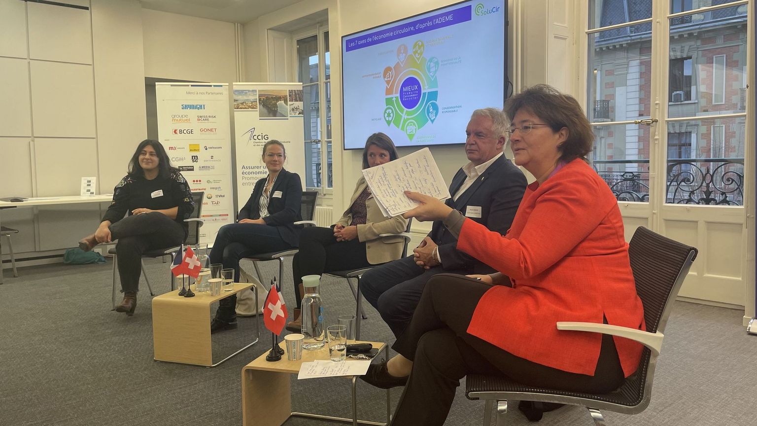 Comment intégrer une démarche d'économie circulaire au sein de son entreprise ? Pour quels bénéfices ? Quelles différences de visions et de pratiques de part et d'autre de la frontière ? Qu'en est t'il de la circularité des matières premières à l'échelon régional ? Quelles sont les procédures douanières ? Beaucoup d'interrogations autour du thème de cette 4ème et dernière Table ronde du Grand Genève de l'année qui s'est tenue à la CCIG. Dernier exercice de modération pour Alexandra Rys qui, comme à l'accoutumée, à brillamment challengé nos panélistes du jour à savoir :