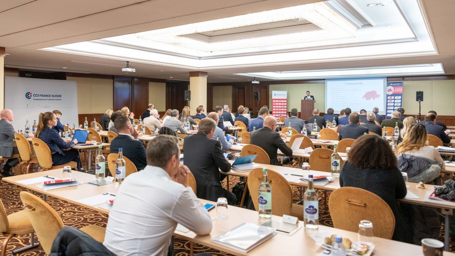 Après une 14ème édition digitale en 2020, les 70 participants, dont une majorité d'entrepreneurs français souhaitant s'implanter ou se développer en Suisse ont eu l'occasion de se retrouver le mercredi 17 novembre à l'hôtel Mövenpick à Genève. Ils ont pu profiter d'une matinée rythmée par les interventions du directeur de la CCI France Suisse, M. Romain Duriez, puis d'un représentant du Greater Geneva Bern area (GGBa) à savoir M. Thierry Baglan, ainsi que Me Olivier DUNANT, associé de l'étude Eversheds Sutherland, suivi de Mme. Virginie VON PLANTA et Jean-Philippe KEIL experts fiscalité et comptabilité pour Mazars Suisse puis M. Louis Pigeon, Directeur de IBC Insurance Broking and Consulting SA, qui à présenté le système social suisse.
