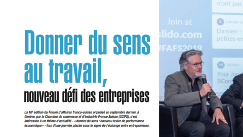 Découvrez la double page consacrée à la conférence "Donner du sens : nouveau levier de performance économique" à l'occasion de la 10ème édition du Forum d'Affaires Franco Suisse qui s'est tenue le 25 septembre à Genève.