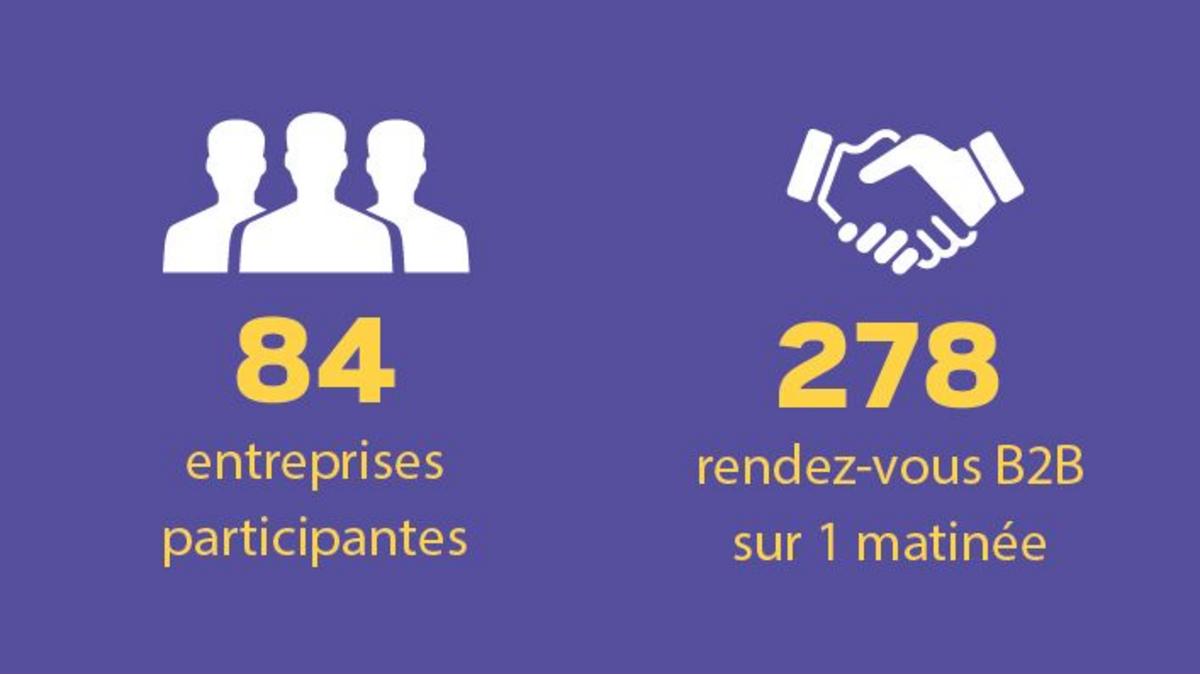 Le e-B2B Franco-Suisse #9 s'est tenu ce vendredi 6 octobre 2023 et a accueilli 84 entreprises telles que Adecco, b-sharpe, CATM, Business France, CMP Automation, Dassault Systèmes, Eversheds Sutherland, Fert & Cie, le Greater Geneva Bern area, l'Hôtel des Horlogers, IT Systèmes, Primco, Procadres, la Promotion économique du canton de Berne, Schneider International, TGV Lyria et bien d'autres. Plus de 270 rendez-vous d’affaires se sont tenus sur la matinée et ont permis des échanges de qualité entre les participants.