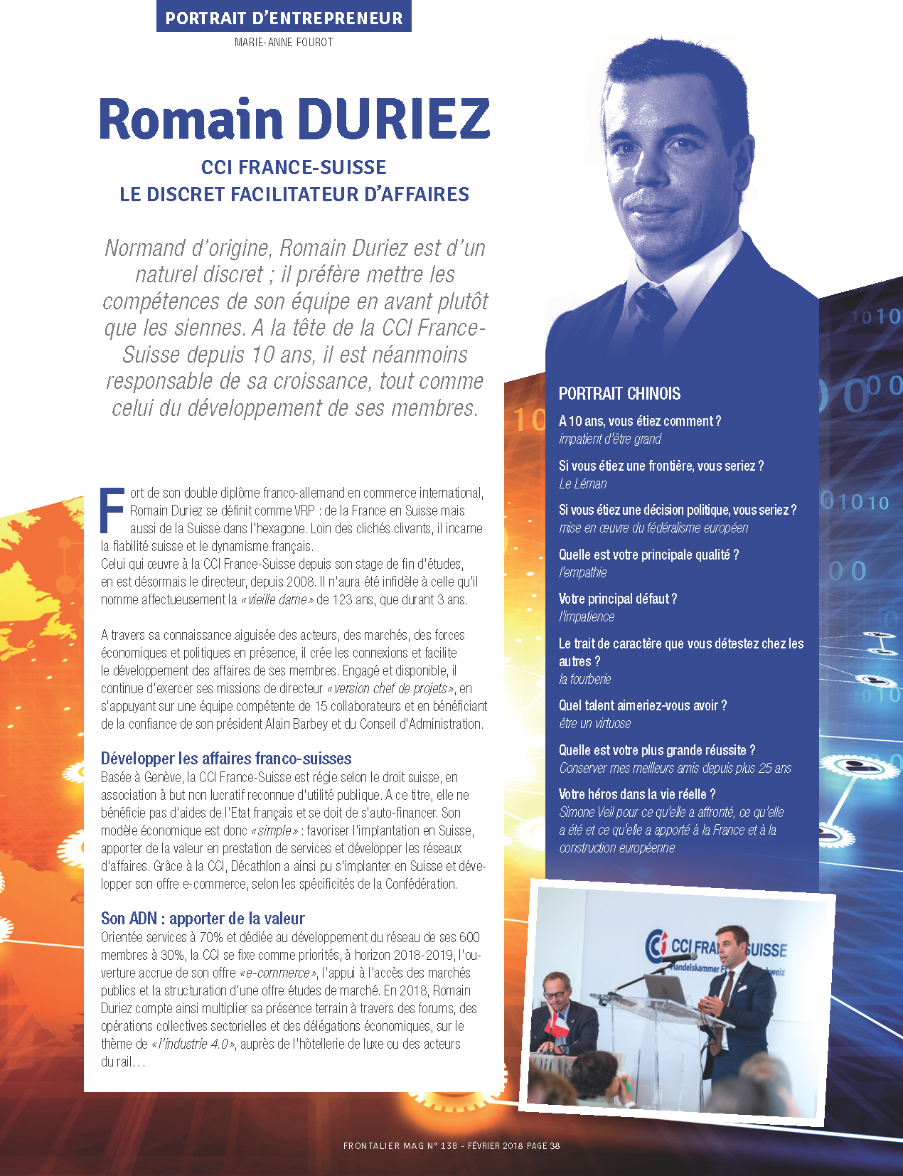 "Normand d'origine, Romain Duriez est d'un naturel discret ; il préfère mettre les compétences de son équipe en avant plutôt que les siennes. A la tête de la CCI France-Suisse depuis 10 ans, il est néanmoins responsable de sa croissance, tout comme celui du développement de ses membres [...]"
