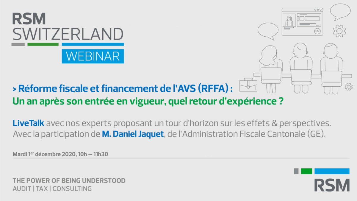RSM Switzerland a le plaisir de vous inviter à la prochaine édition de sa série de webinaire Tax & Legal LiveTalk, qui se tiendra le mardi 1er décembre 2020 de 10h à 11h30h au plus tard, autour d’un de la réforme de l’imposition des entreprises (RFFA), retour d’expérience & perspectives, un an après l’entrée en vigueur de la loi.
