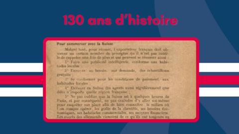 En 1924, l'une des principales mission de la CCI France Suisse était déjà d'accompagner les entrepreneurs français pour faciliter leur implantation en Suisse, avec des conseils qui étaient communiqués dans le Bulletin, la newsletter de l'époque. Cette tradition a perduré jusqu'à nos jours avec le Guide affaires ou ne pas faire en Suisse que nous éditons tous les 2 ans, et dans lequel des experts et membres de la chambre partagent informations, conseils et points d'attention pour comprendre les enjeux et les caractéristiques du marché suisse.