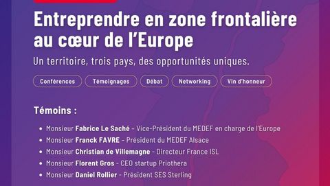 𝗔𝘂 𝗽𝗿𝗼𝗴𝗿𝗮𝗺𝗺𝗲 : Des interventions de haut niveau, dont celles de Fabrice Le Saché (Vice-Président du MEDEF en charge de l’Europe), Franck Favre (Président du MEDEF Alsace), Florent Gros (CEO Priothera), Daniel Rolier (Président SES Sterling) Christian de Villemagne (directeur France ISL) pour explorer les leviers de développement dans le contexte trinational du Rhin supérieur.