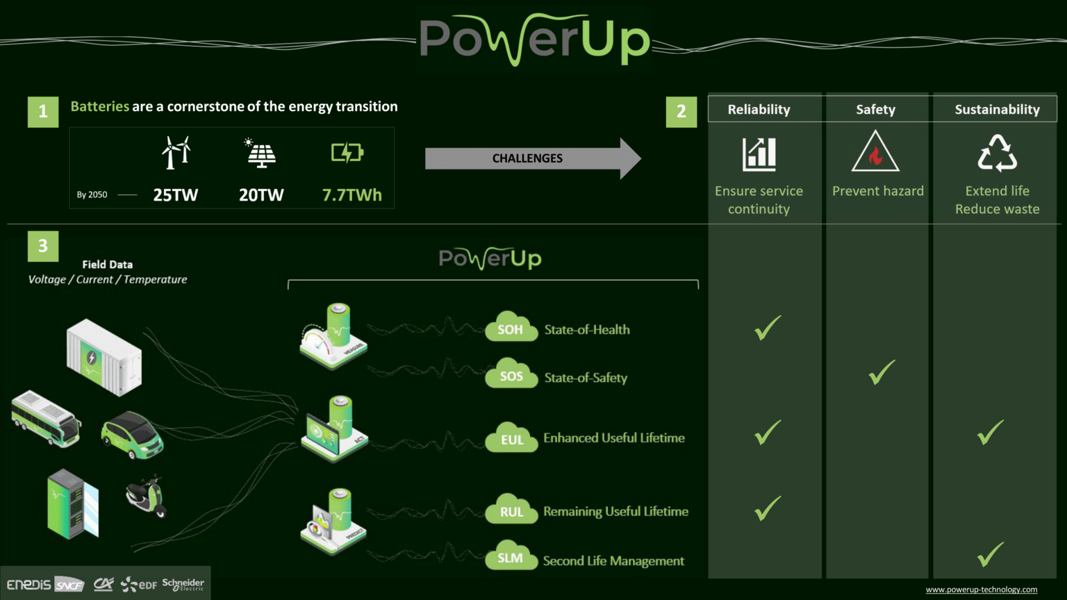La gestion et la supervision d’un parc de batteries se fonde sur la génération d’indicateurs d’état-de-santé (State-of-Health – SoH) précis et fiables. Les solutions PowerUp vous donnent accès à ces indicateurs pour :