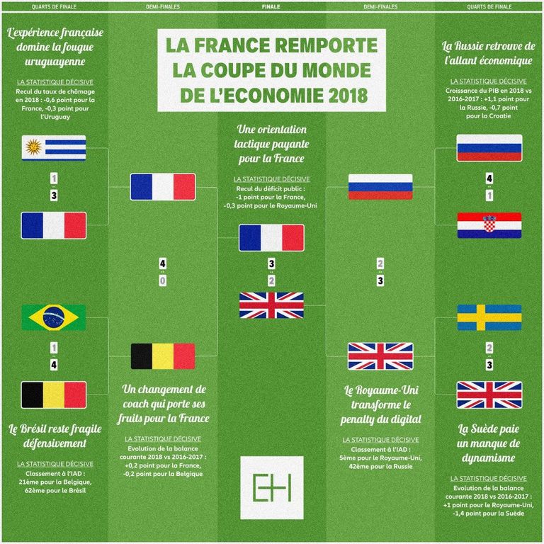Ils ne sont plus que 8 en lice pour remporter la Coupe du Monde de football 2018. Mais parmi ces 8 pays, qui deviendra champion du monde l’économie ?