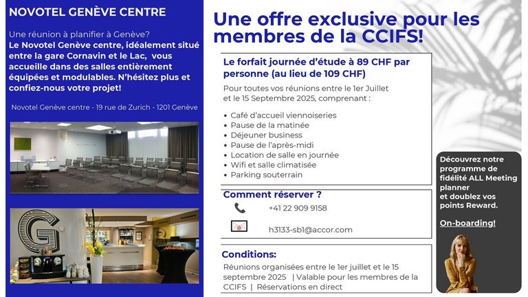 Le Novotel Genève Centre, idéalement situé entre la gare Cornavin et le Lac, vous accueille dans des salles entièrement équipées et modulables.