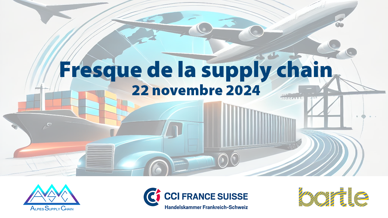 Alpes Supply Chain et la CCI France Suisse (CCIFS) sont ravis de co-organiser un événement exclusif : l'Atelier Fresque de la Supply Chain, qui se tiendra à Genève le 22 novembre 2024 à la CCIFS à Genève. Cet atelier, animé par les experts du cabinet Bartle, est destiné principalement aux industriels, distributeurs et logisticiens.