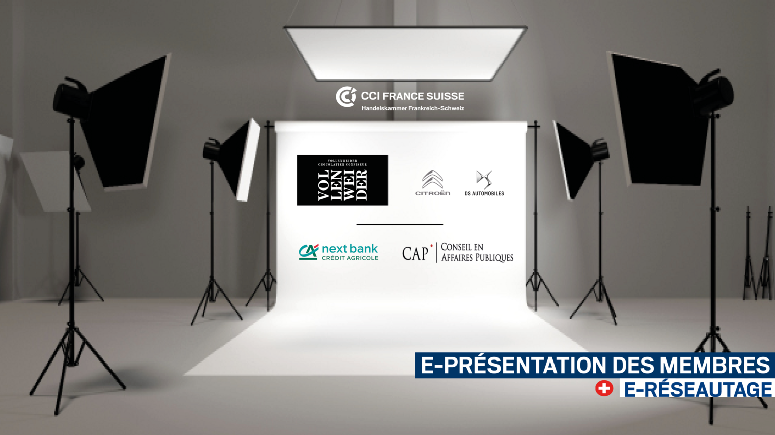E-Présentation des membres modérée par Claire Louis, Directrice Commerciale de la CCI France-Suisse. Entreprises présentes : * Vollenweider Chocolatier Confiseur * Citroën et DS Automibles * CA Next Bank * CAP - Conseil en Affaires Publiques |