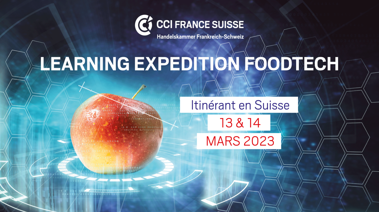 La CCI France Suisse vous donne rendez-vous les 13 et 14 mars 2023 pour une Learning Expedition dédiée au secteur de la FoodTech, à la découverte des projets et acteurs influents du secteur. Une occasion unique pour décrypter cet écosystème en pleine mutation et découvrir les dernières innovations en exclusivité.
