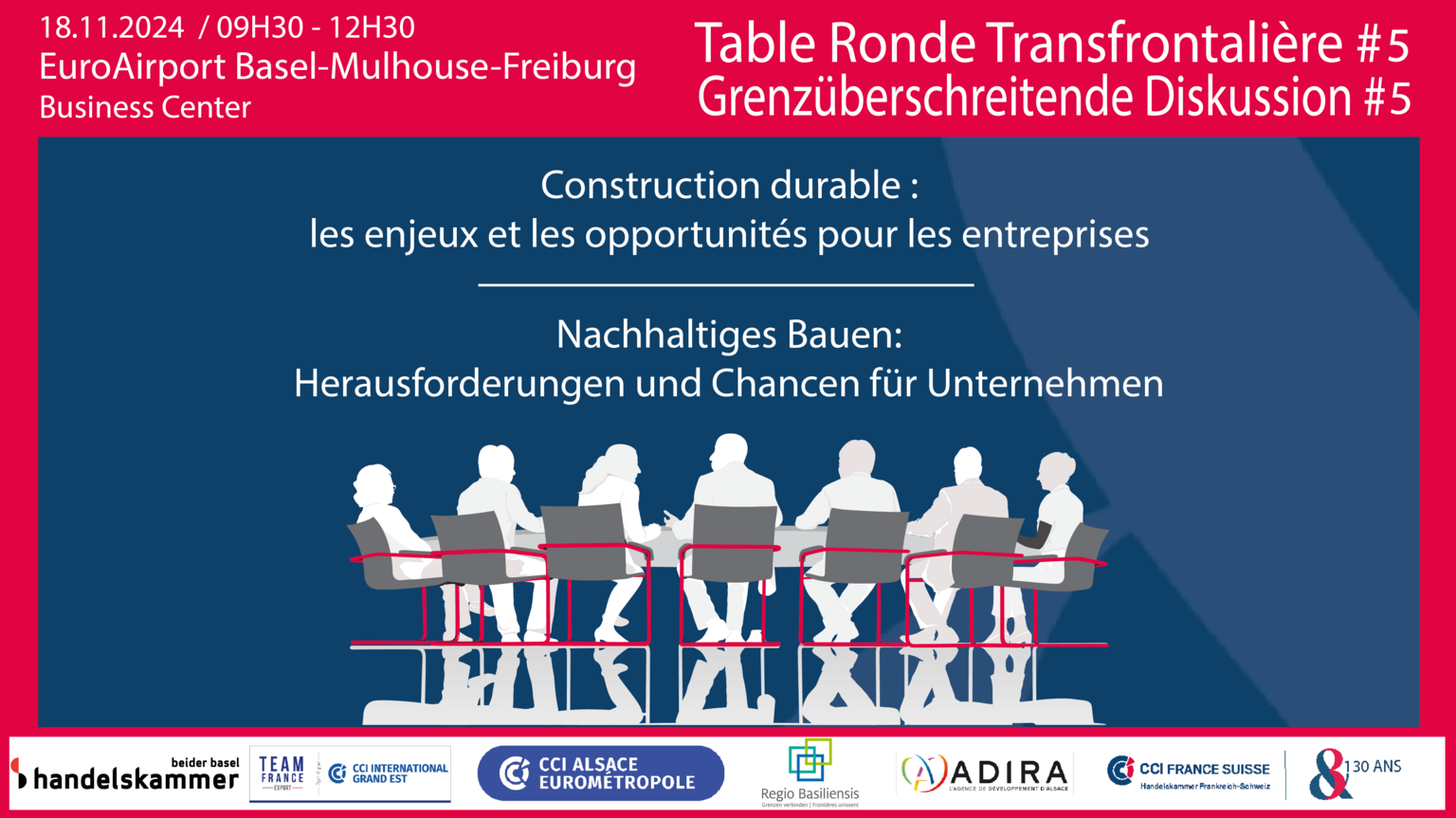 Nous vous invitons à participer à la cinquième édition des Tables-Rondes Transfrontalières, organisée par la CCI France Suisse en partenariat avec nos organisations économiques régionaux : Handelskammer Beider Basel, Adira, Regio Basiliensis, CCI Grand Est et CCI Alsace Eurométropole.