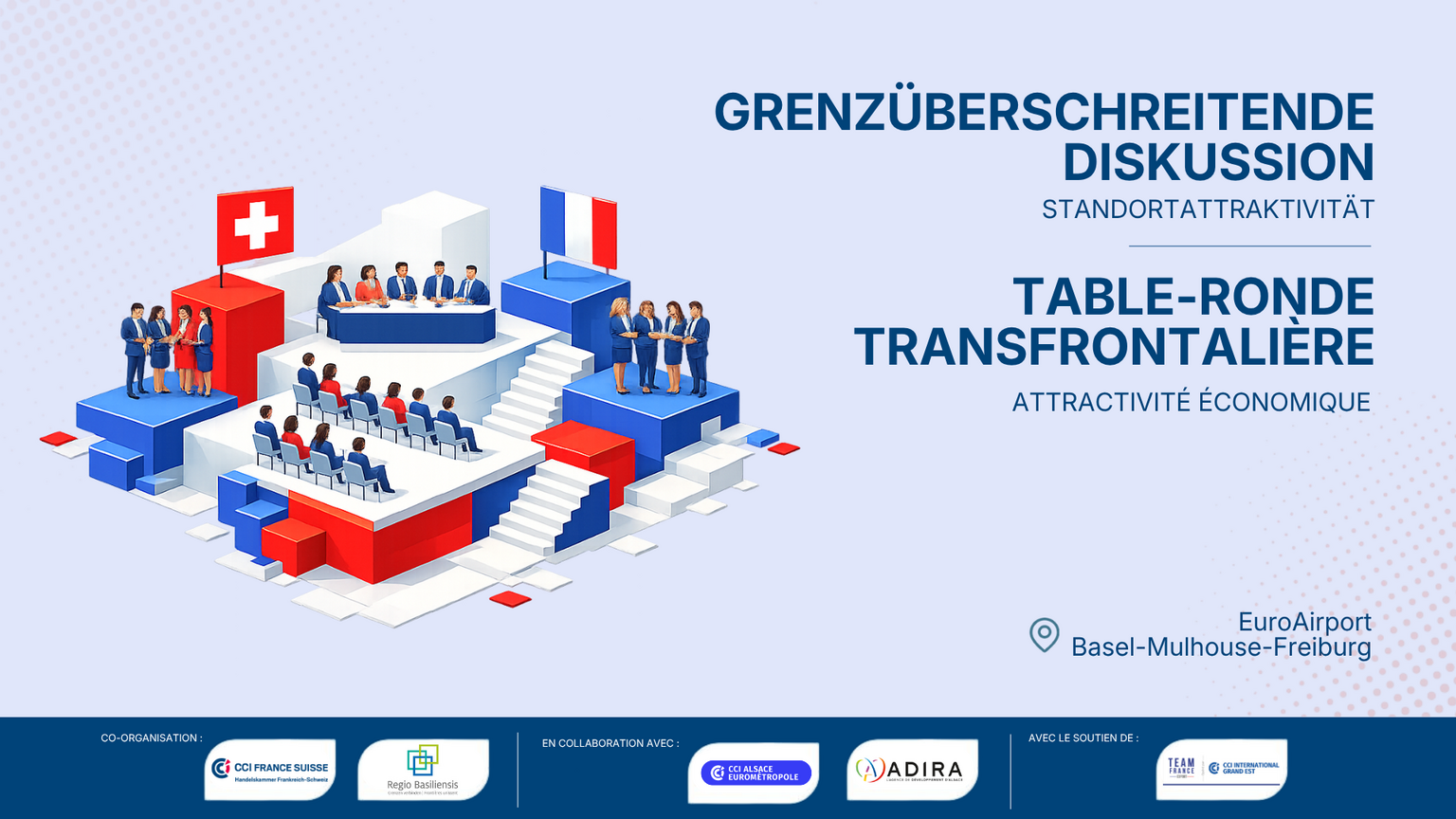 Die 9. Ausgabe der Grenzüberschreitende Diskussion, organisiert von der Handelskammer Frankreich Schweiz in Zusammenarbeit mit der Adira, der Regio Basiliensis, der CCI International Grand Est sowie der CCI Alsace Eurométropole, findet am Montag, den 22. Juni 2026, von 9:30 bis 12:30 Uhr am EuroAirport Basel-Mulhouse-Freiburg statt.