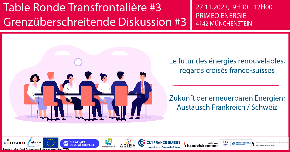 Après le succès de la seconde Table Ronde Transfrontalière au centre d'affaires LeBooster Bâle, la CCI France Suisse, associée à cinq partenaires économiques de la région de Bâle*, se réjouit de vous retrouver à la troisième Table Ronde Transfrontalière qui aura lieu :