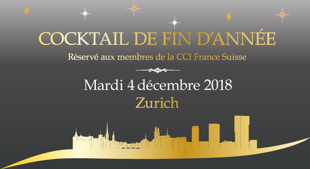 L'antenne zurichoise de la CCI France Suisse organise le mardi 4 décembre à Zurich un cocktail de fin d'année, l'occasion de partager une soirée conviviale avec les membres du 1er réseau d'affaires franco-suisse et les remercier pour leur fidélité.